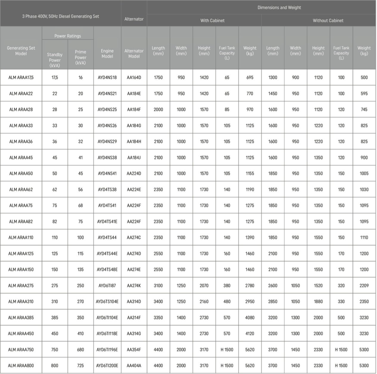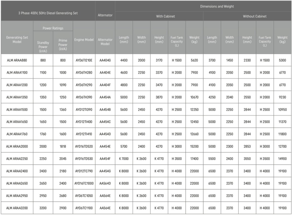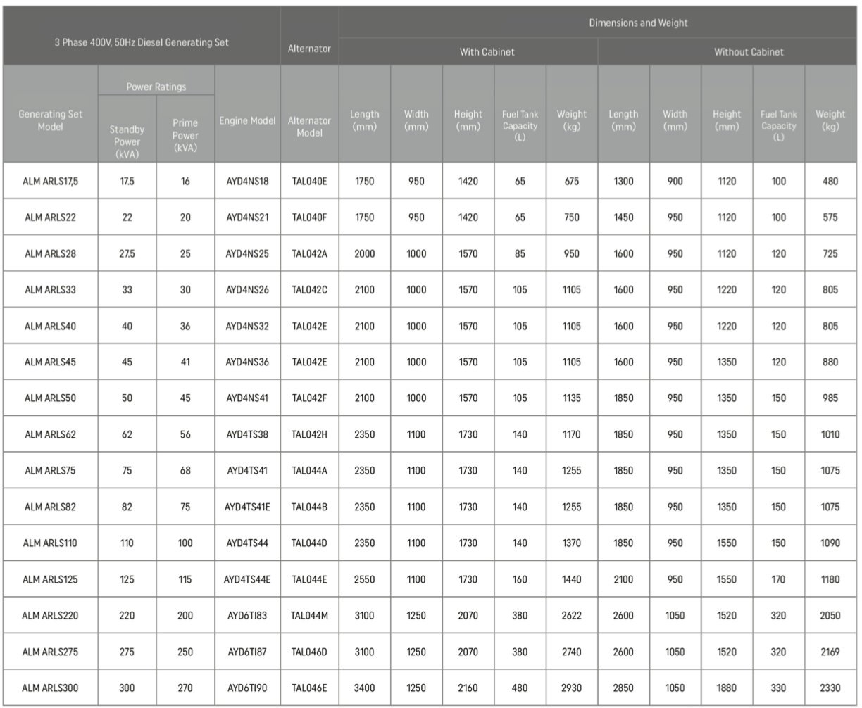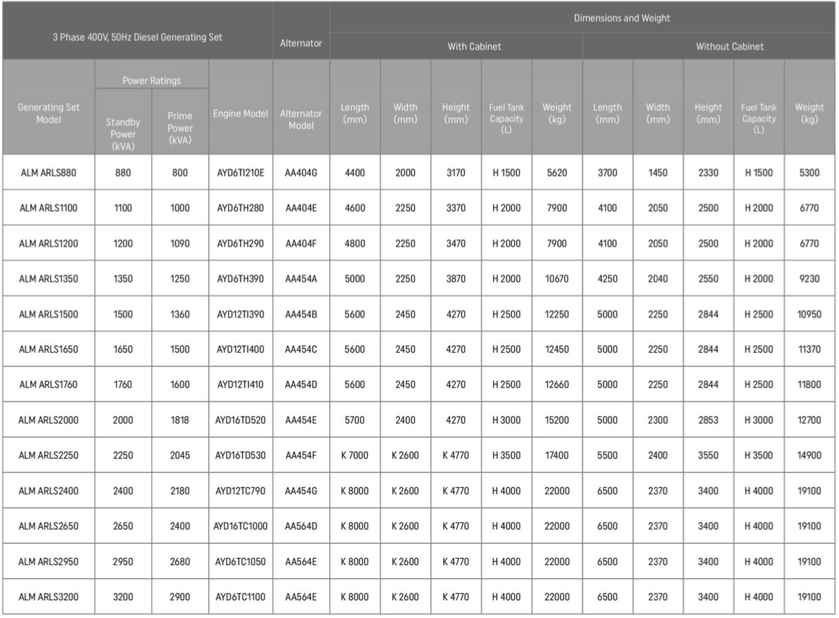 • Standard 50 Hz, 400/230 V output voltage