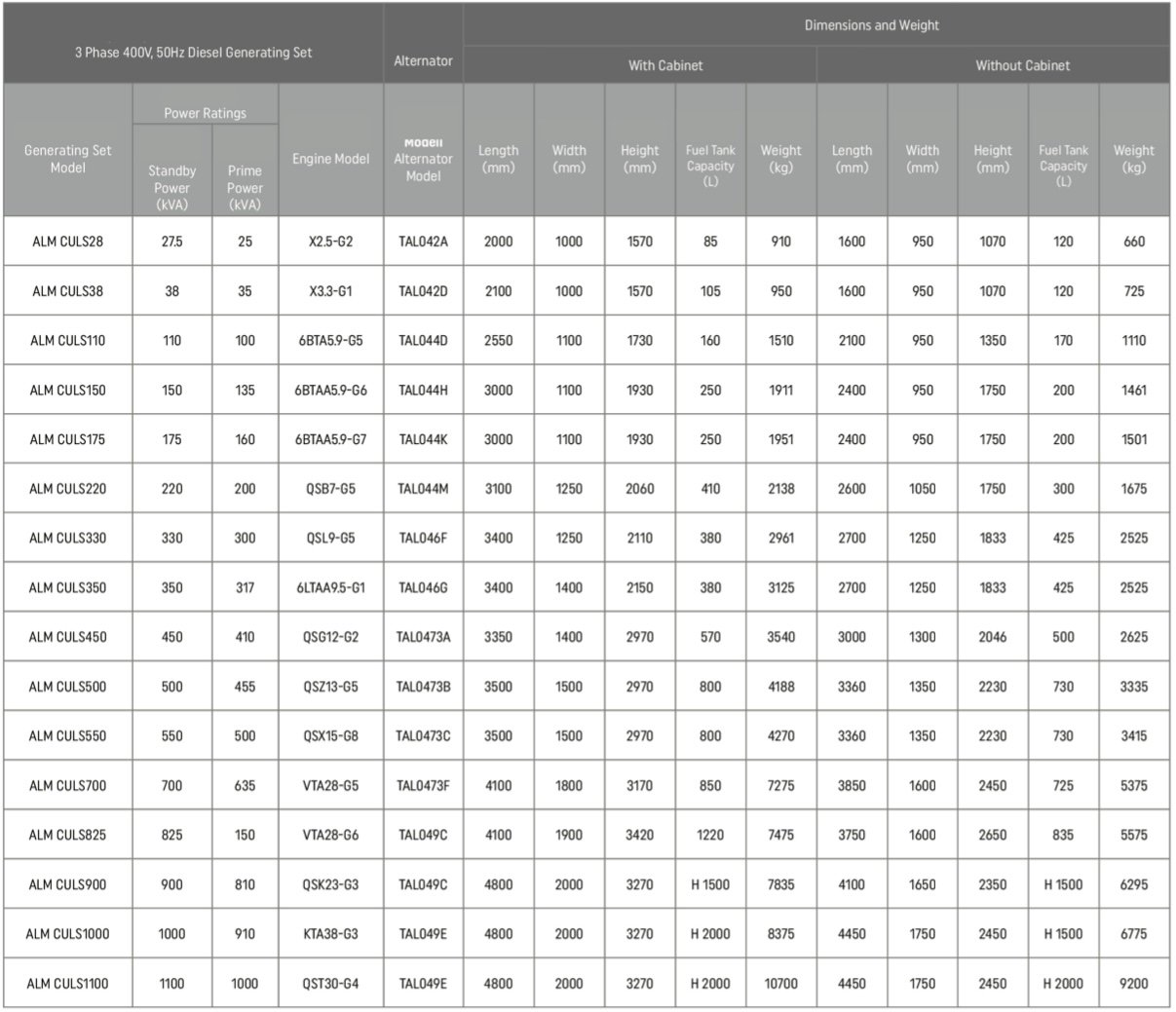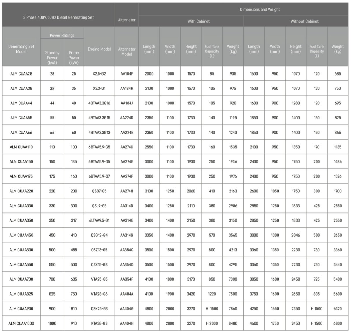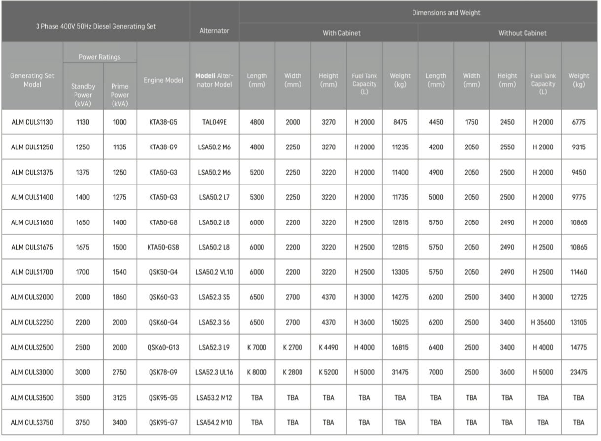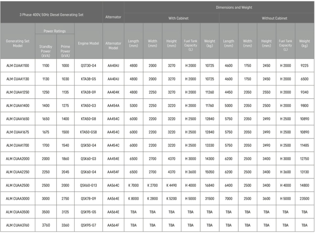 - CUMMINS brand, 4-stroke, water-cooled, 1500 rpm diesel engine